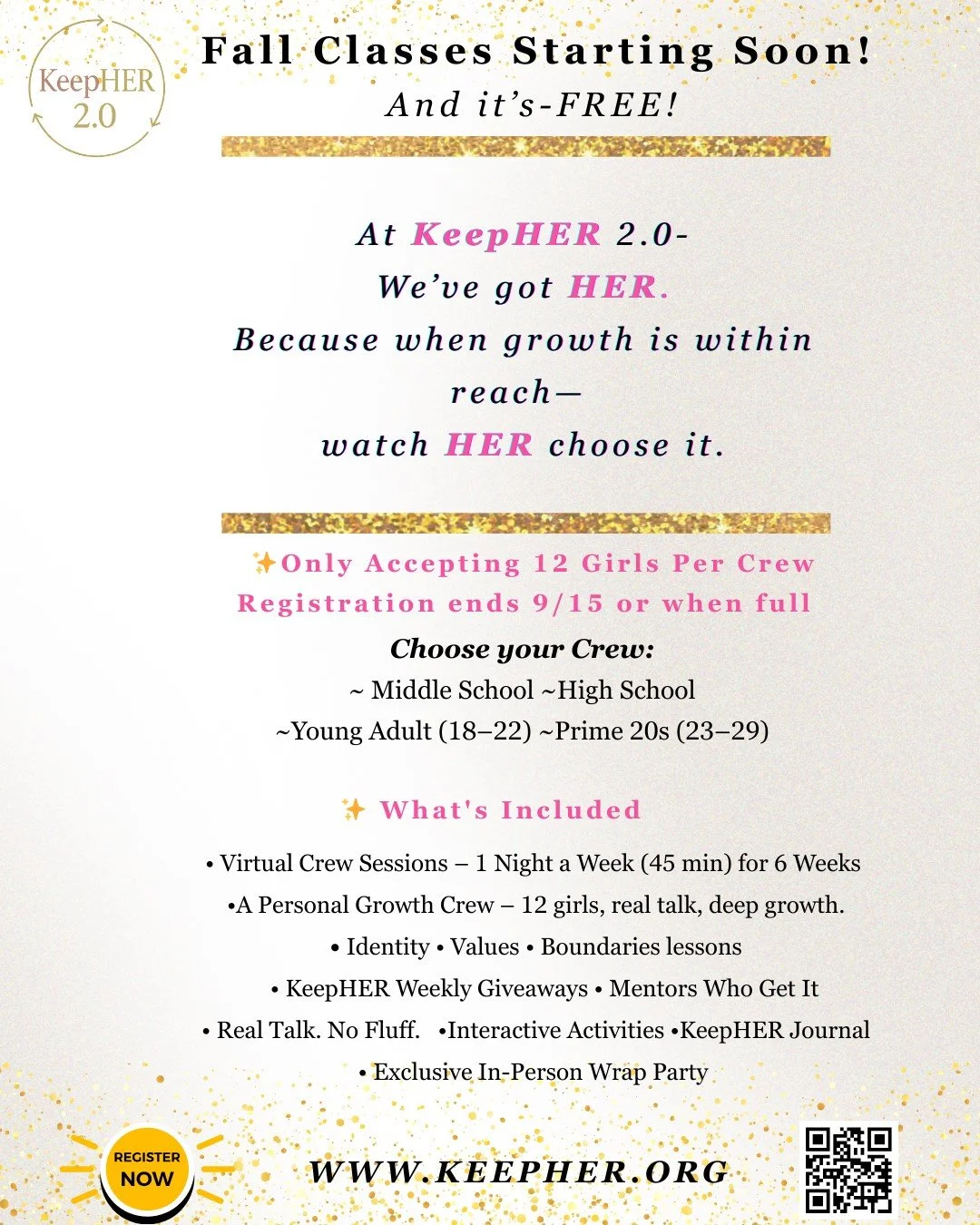 At KeepHER, we guide young women to rediscover their worth, speak truth, and stand in who God says they are. -